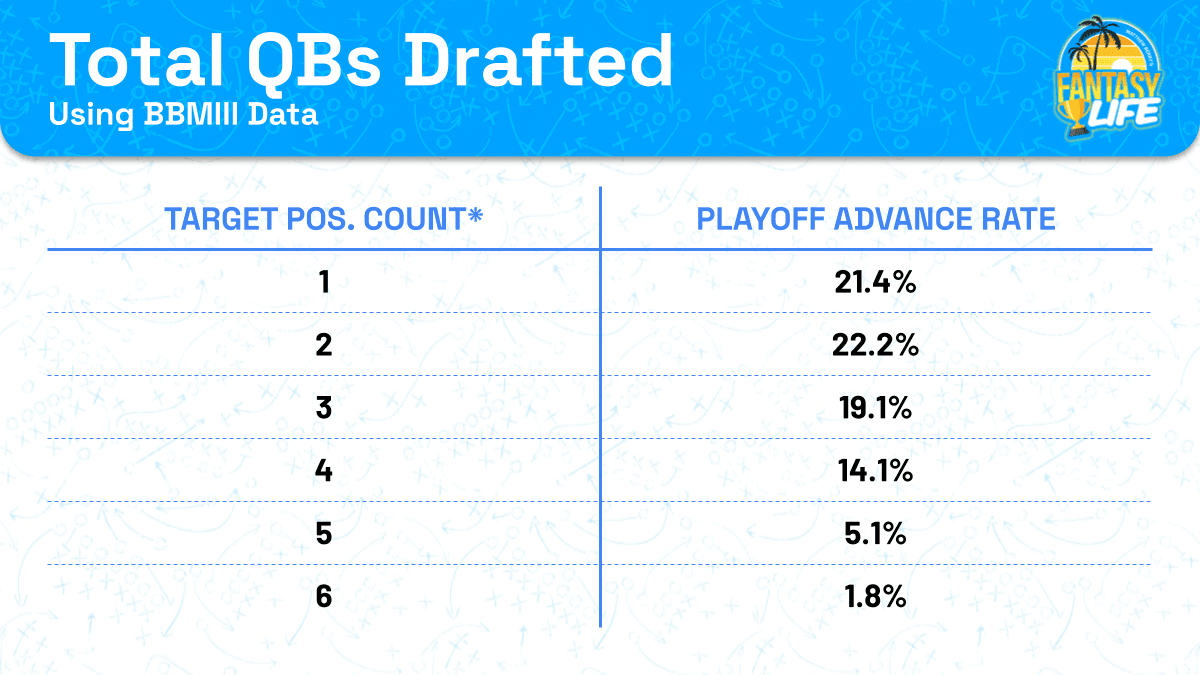 4for4’s Underdog Roster Construction Tool allows users to scan rosters created across the last three seasons to see how often (and how deep) they made it into the playoffs. And with a baseline advance of 16.7%, taking a QB before Round 6 and stopping at three total was optimal.
