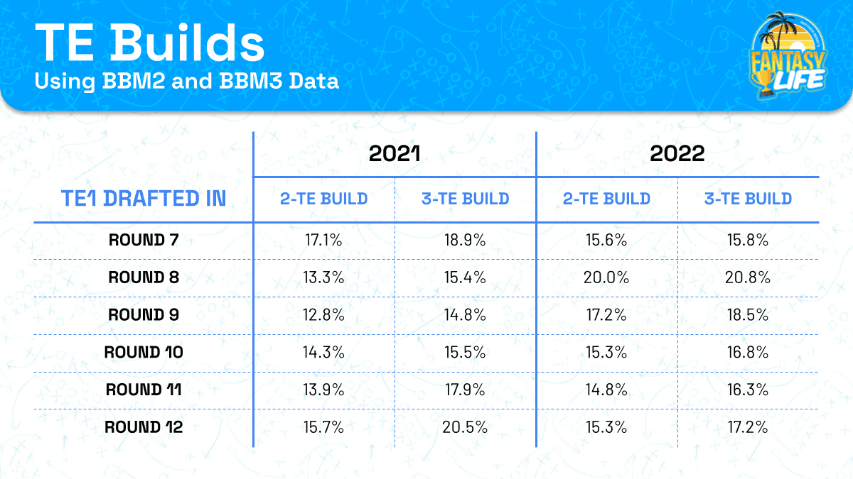 And while taking a TE right at the start of the middle rounds was optimal in ’21 (both TE builds were above the baseline advance rate), you can see the advance rates trend up toward the 12th round. So if you add opportunity cost into the equation, again, waiting paid dividends.