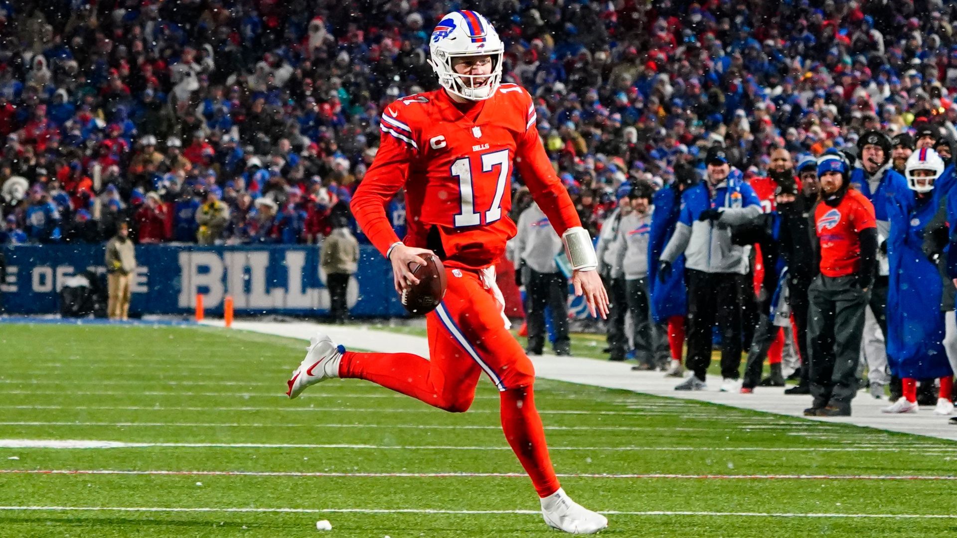 Dec 17, 2022; Orchard Park, New York, USA; Buffalo Bills quarterback Josh Allen (17) runs with the ball against the Miami Dolphins during the second half at Highmark Stadium. Mandatory Credit: Gregory Fisher-USA TODAY Sports