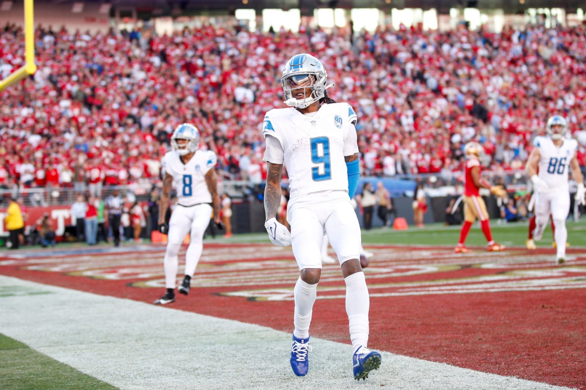 Lions wide receiver Jameson Williams celebrates a touchdown against the 49ers in the first quarter of the NFC championship game at Levi's Stadium in Santa Clara, California, on Sunday, Jan. 28, 2024.