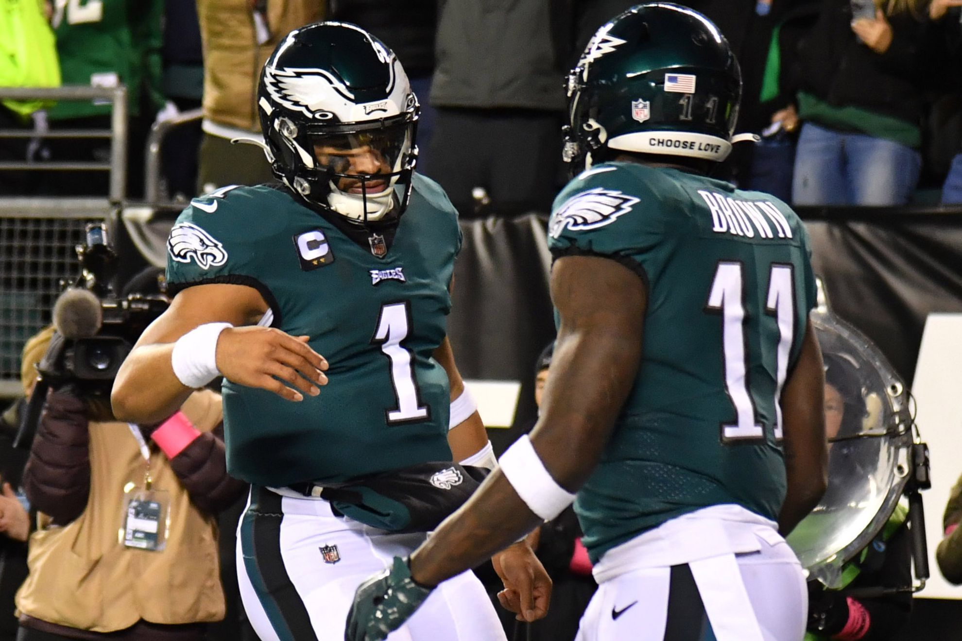 Jan 21, 2023; Philadelphia, Pennsylvania, USA; Philadelphia Eagles quarterback Jalen Hurts (1) celebrates his touchdown with wide receiver A.J. Brown (11) during the second quarter against the New York Giants during an NFC divisional round game at Lincoln Financial Field. Mandatory Credit: Eric Hartline-USA TODAY Sports