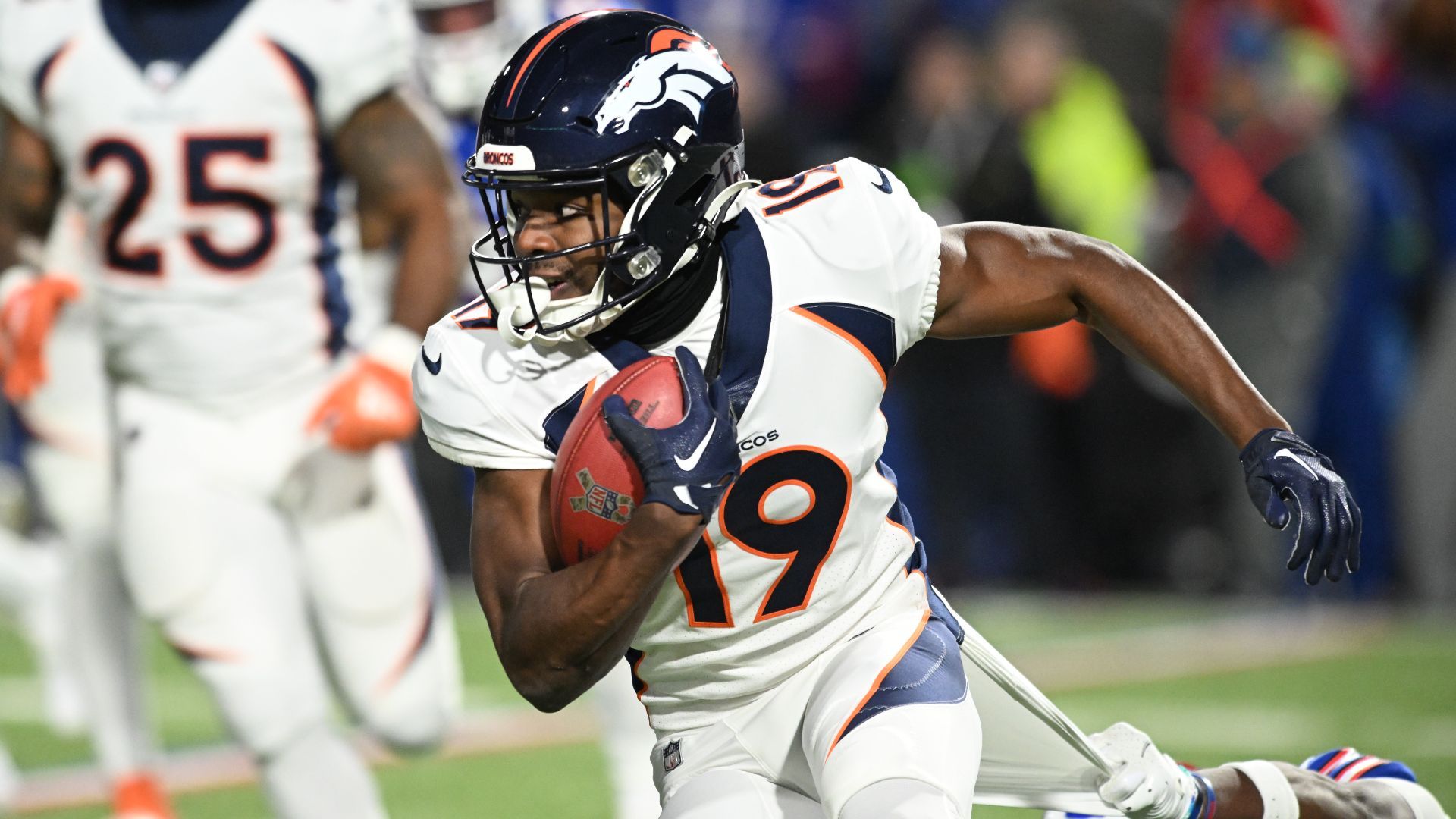 Nov 13, 2023; Orchard Park, New York, USA; Denver Broncos wide receiver Marvin Mims Jr. (19) returns a kickoff against the Buffalo Bills in the third quarter at Highmark Stadium. Mandatory Credit: Mark Konezny-USA TODAY Sports