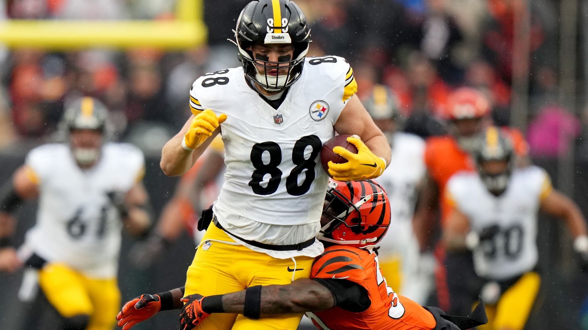 Nov 26, 2023; Cincinnati, Ohio, USA; Pittsburgh Steelers tight end Pat Freiermuth (88) is tackled by Cincinnati Bengals safety Nick Scott (33) after a catch a in the first quarter at Paycor Stadium. Mandatory Credit: Kareem Elgazzar-USA TODAY Sports