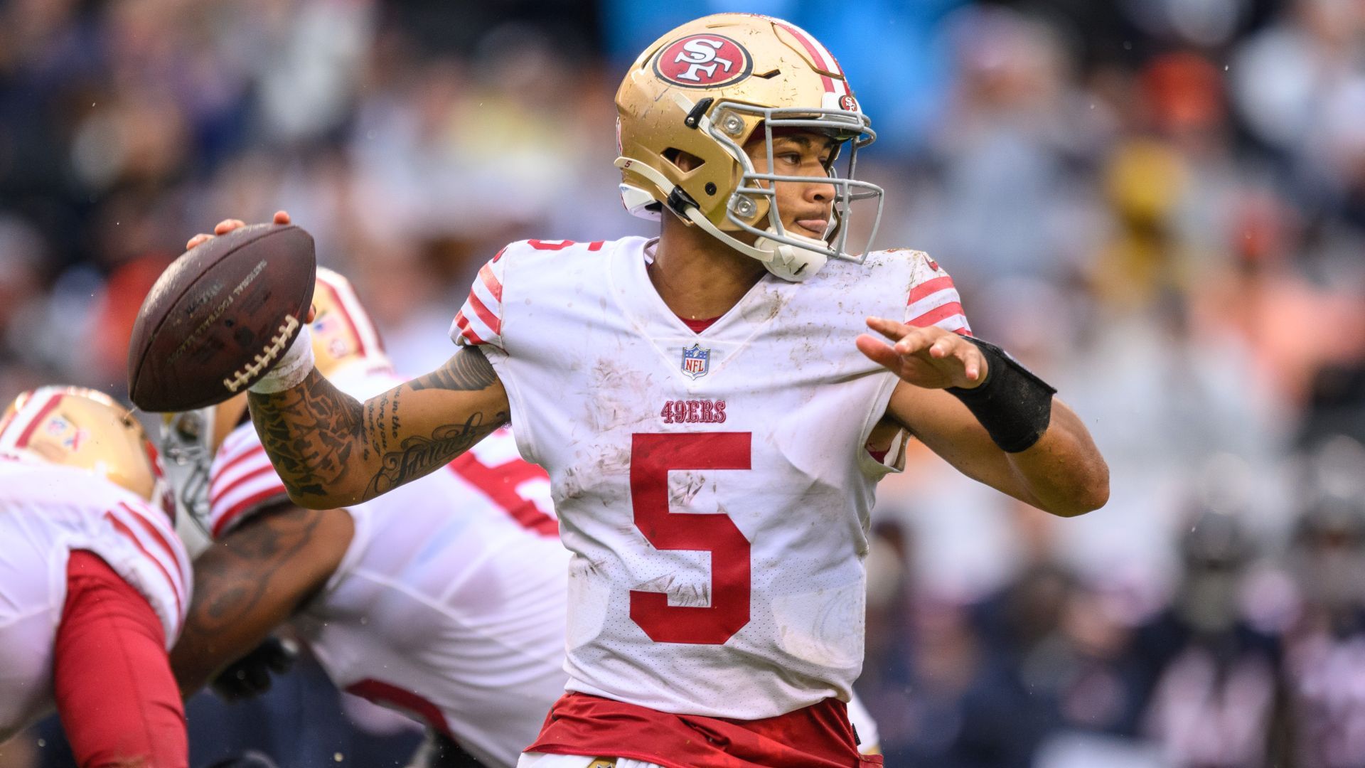 Sep 11, 2022; Chicago, Illinois, USA; San Francisco 49ers quarterback Trey Lance (5) looks to pass in the second quarter against the Chicago Bears at Soldier Field. Mandatory Credit: Daniel Bartel-USA TODAY Sports