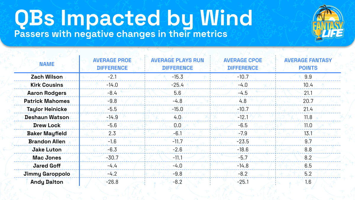 Fantasy managers use multiple sources to draw their conclusions. Weather effects shouldn’t be any different. In fact, because of the small sample sizes, a push for more variables to pivot on should be anyone’s starting point. And since we’ve got three (PROE, CPOE, and total plays), we can see which passers become problematic against the wind.