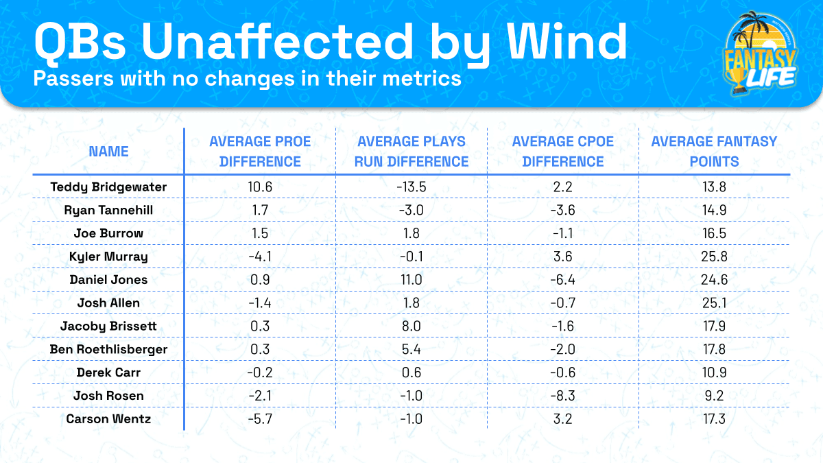 So while high-end rushing talents like Allen and Murray will always garner our attention, we should consider passers with some wiggle in inclement conditions.