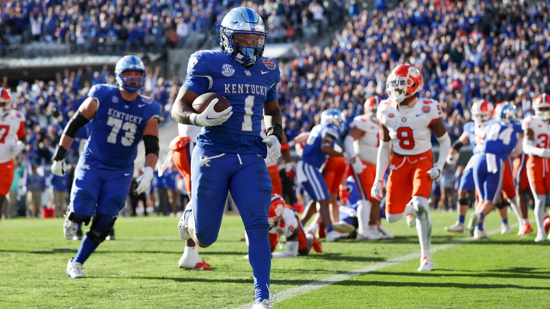 Dec 29, 2023; Jacksonville, FL, USA; Kentucky Wildcats running back Ray Davis (1) runs into the end zone for a touchdownagainst the Clemson tigers in the fourth quarter during the Gator Bowl at EverBank Stadium. Mandatory Credit: Nathan Ray Seebeck-USA TODAY Sports