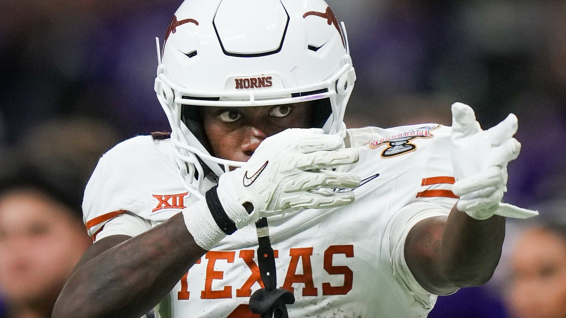 Jan 1, 2024; New Orleans, LA, USA; Texas Longhorns wide receiver Xavier Worthy (1) celebrates a play in the fourth quarter against the Washington Huskies in the 2024 Sugar Bowl college football playoff semifinal game at Caesars Superdome. Mandatory Credit: Sara Diggins/American-Statesman-USA TODAY Sports