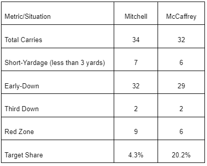 The two played in three games (Week 18 was a blowout against Arizona, with Jordan Mason getting on the field) and nearly split the workload. Even if you included targets, Mitchell had more high-value touches than McCaffrey. Granted, it’s a small sample size, but it indicates how Kyle Shanahan intended to deploy this potent pair of players.