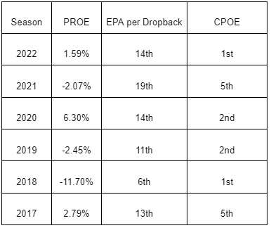 Seattle ended 2022 8th in PROE, with data indicating teams are likeliest to have a similar strategy the following season, given coaching and personnel continuity. Shane Waldron will be back as OC, and all the Seahawks’ key offensive starters will return. Plus, they made some pass-friendly additions through the draft: