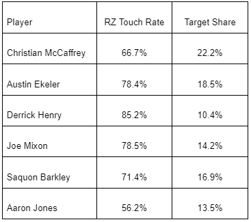 We know targets and attempts (or looks) from inside an opponent’s red zone are more valuable. Just look at the volume RBs with advance rates above the average baseline (16.7%) in BBM III secured.