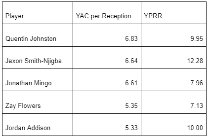 Mingo’s after-the-catch averages and efficiency per route on short and intermediate targets align with his peers. So, without much competition in front of Mingo, drafters would be prudent to place bets on his takeover of the Panthers’ offense during his rookie campaign.