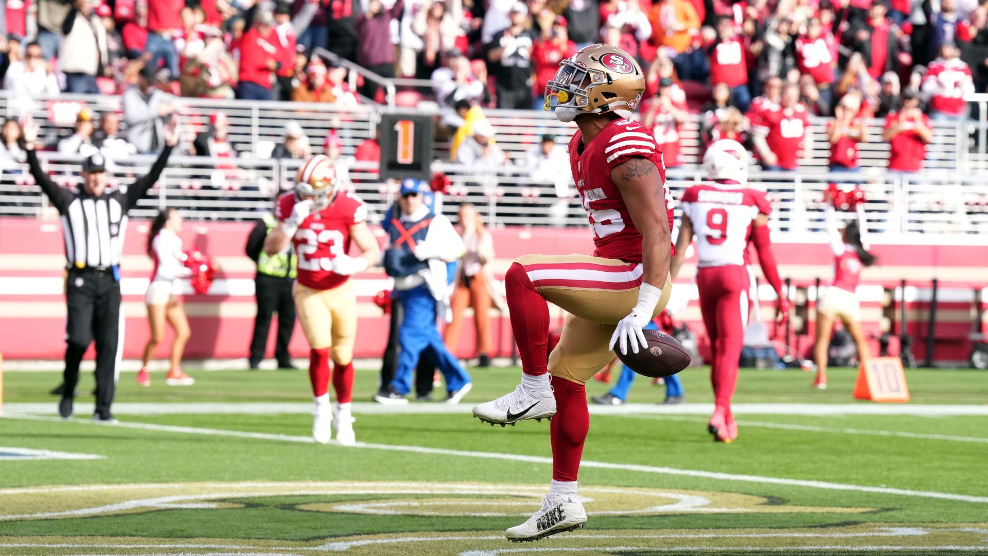 Jan 8, 2023; Santa Clara, California, USA; San Francisco 49ers running back Elijah Mitchell (25) reacts after scoring a touchdown against the Arizona Cardinals during the second quarter at Levi's Stadium. Mandatory Credit: Darren Yamashita-USA TODAY Sports