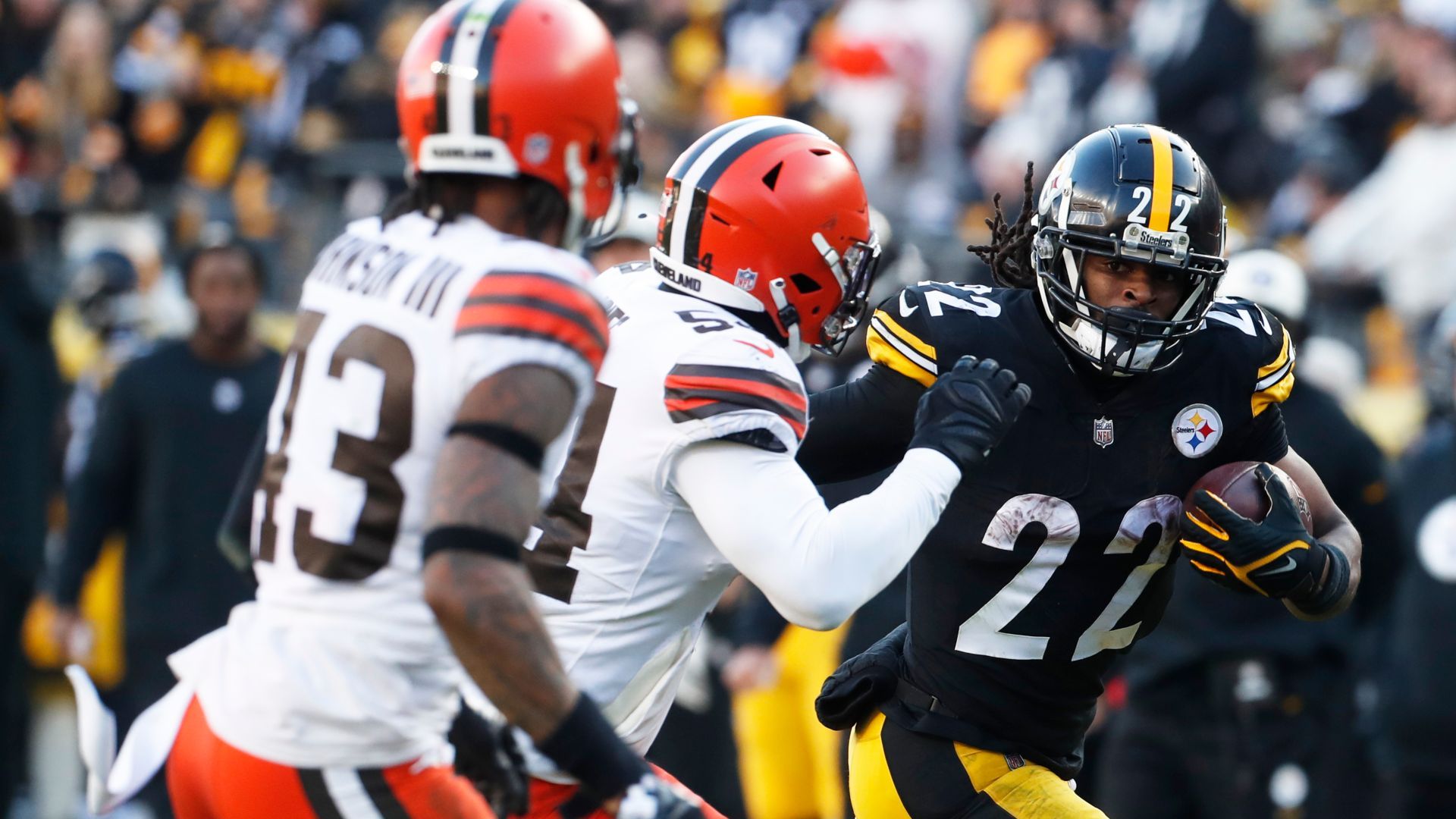 Jan 8, 2023; Pittsburgh, Pennsylvania, USA; Pittsburgh Steelers running back Najee Harris (22) runs the ball against Cleveland Browns safety John Johnson III (43) and linebacker Deion Jones (54) during the third quarter at Acrisure Stadium. Pittsburgh won 28-14. Mandatory Credit: Charles LeClaire-USA TODAY Sports