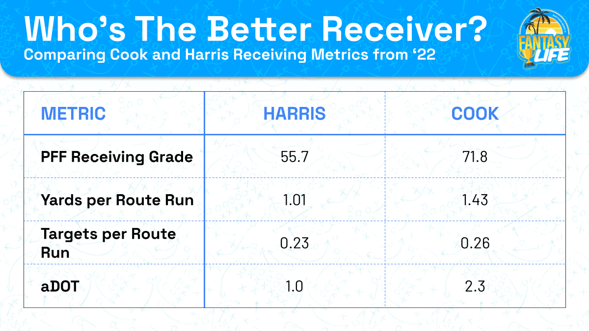 Cook’s rushing metrics from ’22 favorably compare to Harris’s. Plus, Cook also established himself as a viable receiving option. Harris (and Allen) will vulture a short score or two, but Cook has the easier path to weekly fantasy value.