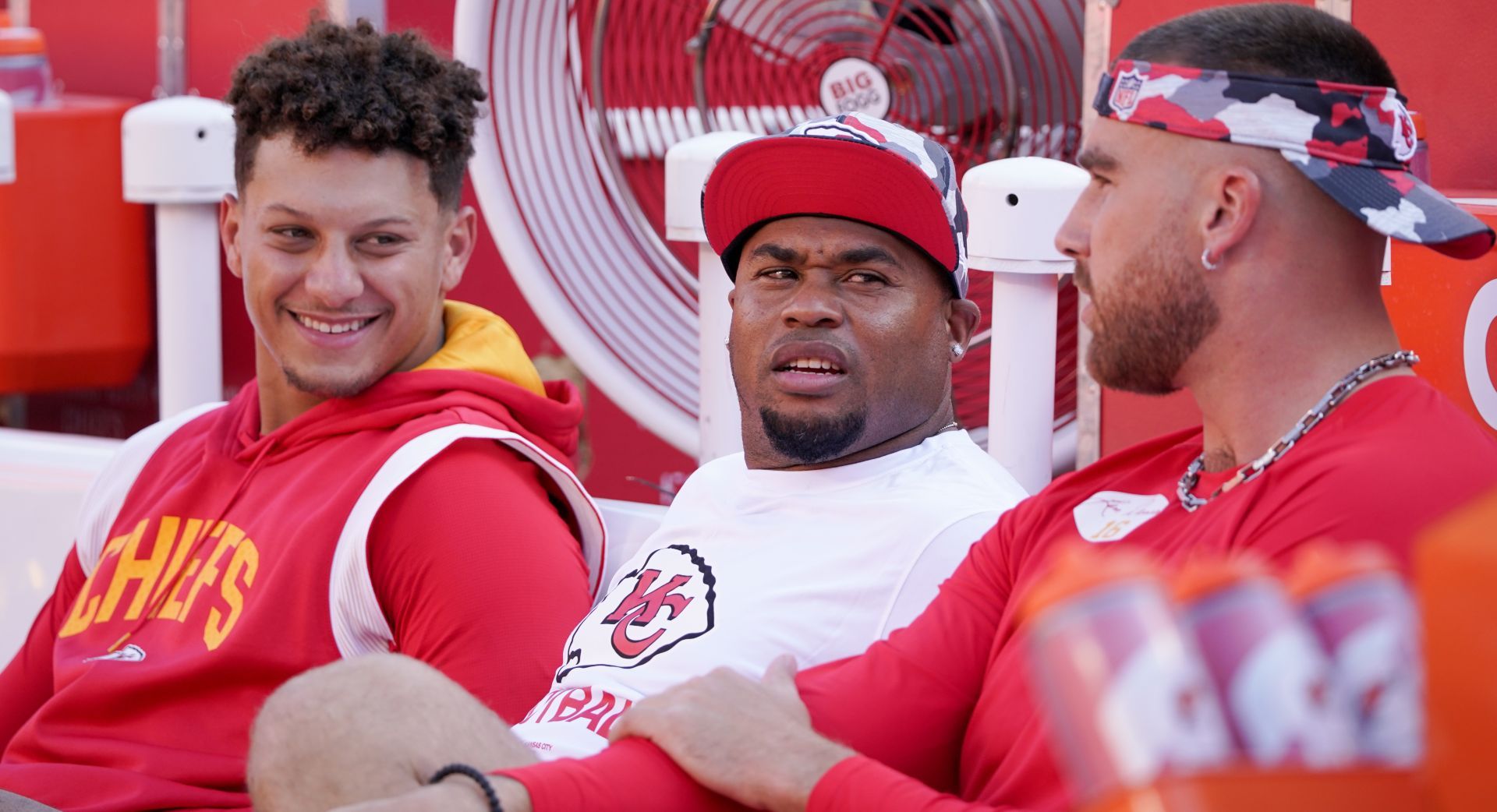 Aug 25, 2022; Kansas City, Missouri, USA; Kansas City Chiefs quarterback Patrick Mahomes (left) and tight end Travis Kelce (right) talk with former NFL receiver Steve Smith (center) before a preseason game against the Green Bay Packers at GEHA Field at Arrowhead Stadium. Mandatory Credit: Denny Medley-USA TODAY Sports
