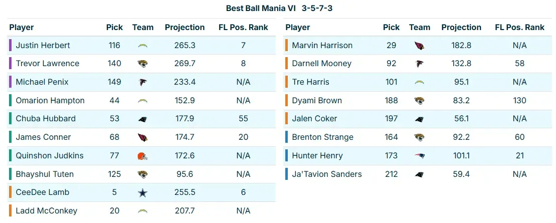 I wanted to spotlight this team because it is a different flavor of Robust RB. We actually started this draft with three straight WRs—CeeDee Lamb, Ladd McConkey, and Marvin Harrison—but then elected to take four straight RBs in Rounds 4-7: