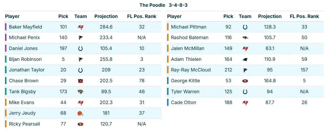 The key to a good hyperfragile build is to understand that you do not need more than four total RBs when you start the draft with three, and that the fourth can come extremely late. This is the ultimate “draft like you are right” exercise. This team needs Bijan Robinson, Jonathan Taylor, and Chase Brown to put up legendary seasons (or at least great ones); otherwise, it is dead on arrival.