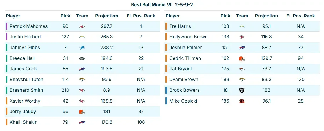 This team ultimately turned out very nice, as we were able to round out our WR room with a nice mix of upside (we still got rookies Tre Harris and Pat Bryant) and solid veterans who correlated (Hollywood Brown with Patrick Mahomes, Joshua Palmer with Cook, and Dyami Brown with Bhayshul Tuten).