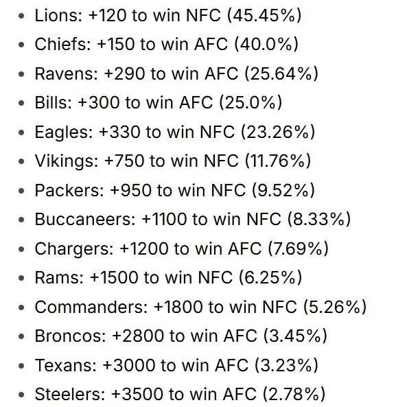 As LaMarca noted in his best ball playoff primer, both of the No. 1 seeds have great shots of advancing into the Super Bowl, and I’ve included the current betting odds table from his article to exemplify that fact.