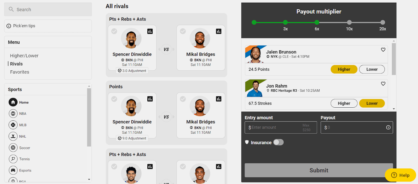 The Higher/Lower pick'em game type essentially asks contestants to make over/under prop bets on specific player stats. These bets are offered on several different statistical categories across many different sports.