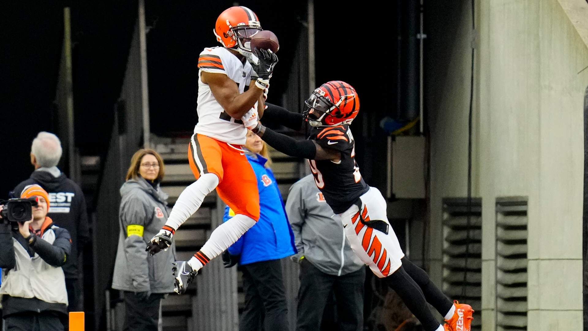 Dec 11, 2022; Cincinnati, Ohio, USA; Cleveland Browns wide receiver Donovan Peoples-Jones (11) bobbles a pass in the end zone under pressure from Cincinnati Bengals cornerback Marvell Tell III (39) in the fourth quarter of the NFL Week 14 game between the Cincinnati Bengals and the Cleveland Browns at Paycor Stadium in Cincinnati on Sunday, Dec. 11, 2022. Mandatory Credit: Sam Greene-USA TODAY Sports