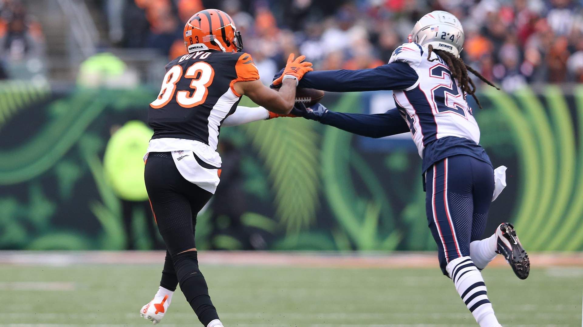 New England Patriots cornerback Stephon Gilmore (24) intercepts a pass intended for Cincinnati Bengals wide receiver Tyler Boyd (83) during the third quarter of an NFL Week 15 game, Sunday, Dec. 15, 2019, at Paul Brown Stadium in Cincinnati. The New England Patriots won 34-13. New England Patriots At Cincinnati Bengals Football 12 15 2019 Photo Credit: Kareem Elgazzar, Cincinnati Enquirer via Imagn Content Services, LLC