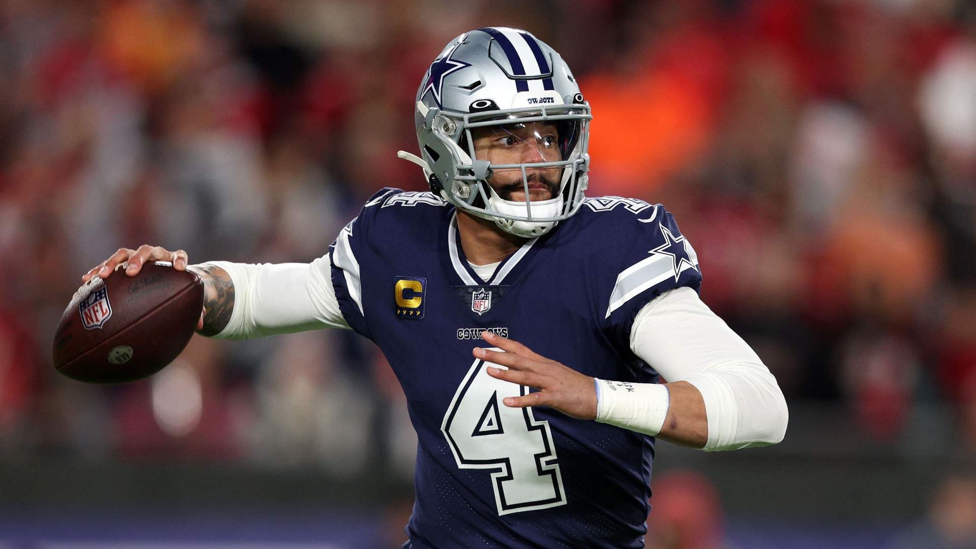 Jan 16, 2023; Tampa, Florida, USA; Dallas Cowboys quarterback Dak Prescott (4) drops back to pass against the Tampa Bay Buccaneers in the first half during the wild card game at Raymond James Stadium. Mandatory Credit: Nathan Ray Seebeck-USA TODAY Sports