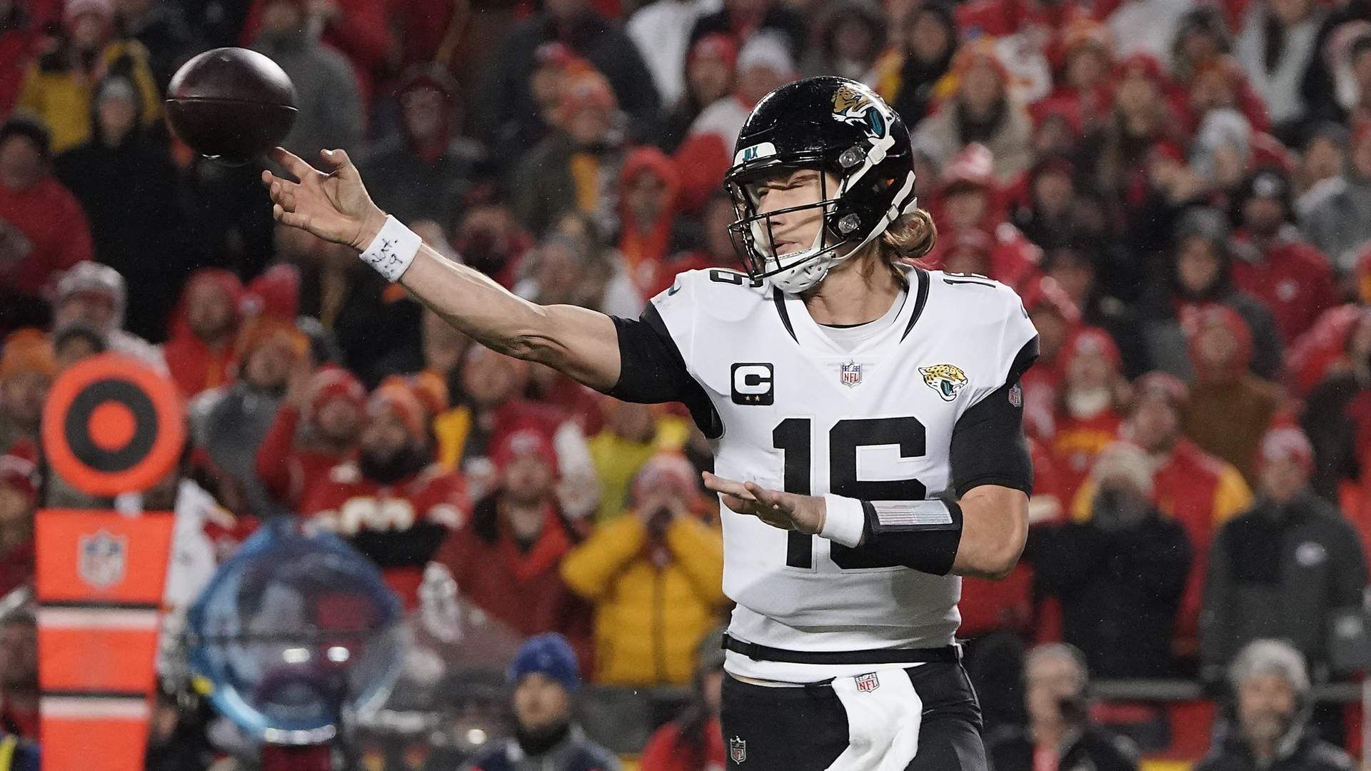 Jan 21, 2023; Kansas City, Missouri, USA; Jacksonville Jaguars quarterback Trevor Lawrence (16) throws against the Kansas City Chiefs during the second half in the AFC divisional round game at GEHA Field at Arrowhead Stadium. Mandatory Credit: Denny Medley-USA TODAY Sports