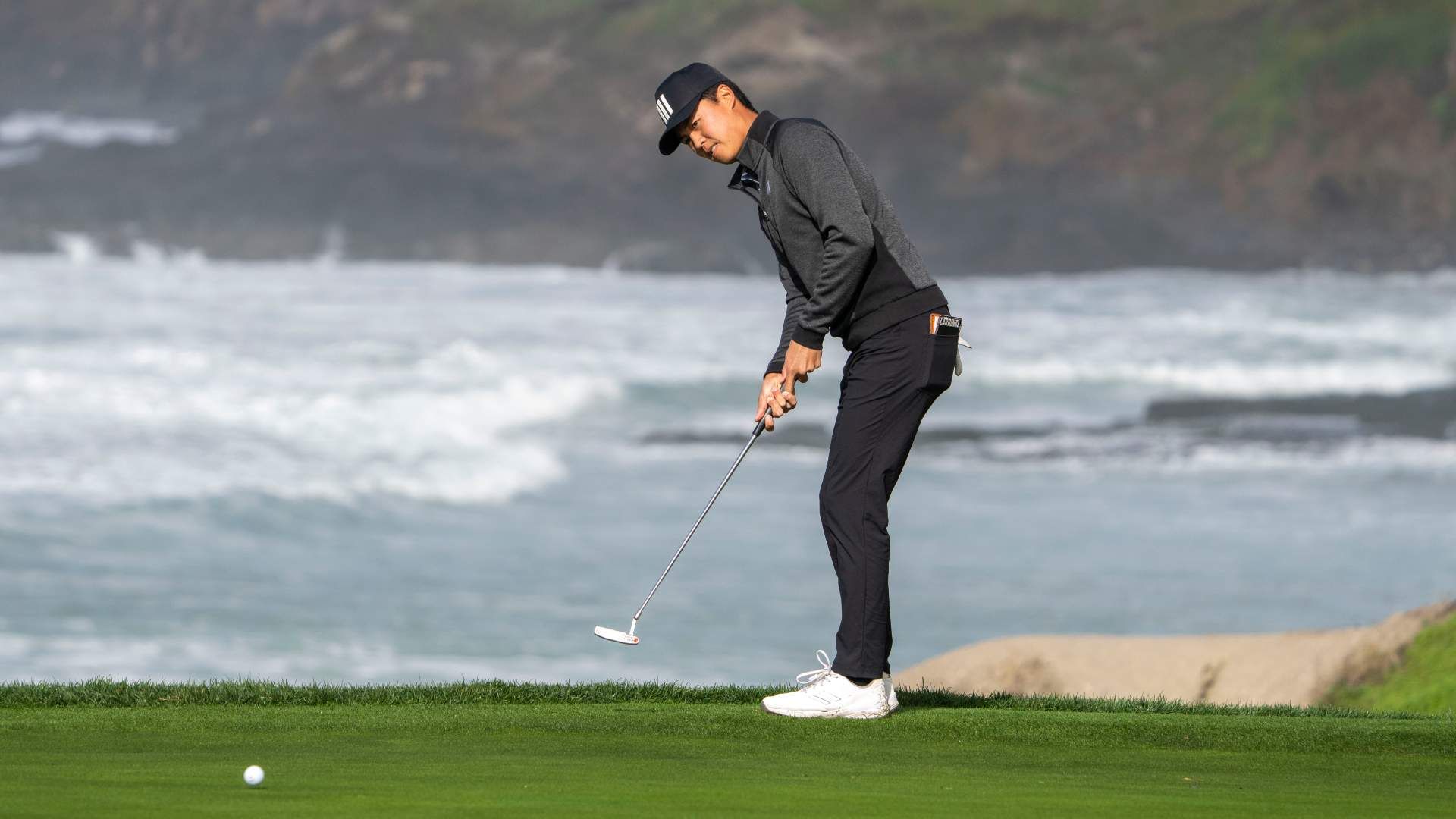 February 1, 2024; Pebble Beach, California, USA; Brandon Wu putts on the 10th hole during the first round of the AT&T Pebble Beach Pro-Am golf tournament at Pebble Beach Golf Links. Mandatory Credit: Kyle Terada-USA TODAY Sports