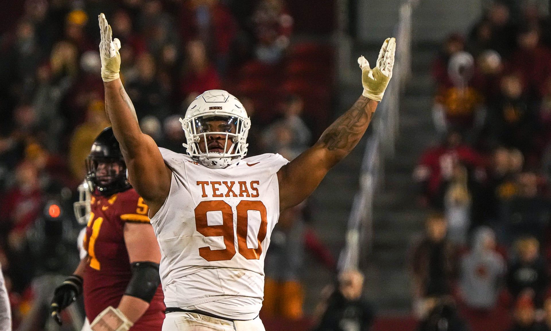 Texas Longhorns defensive lineman Byron Murphy II (90) celebrates sacking Iowa State quarterback Rocco Becht (3) during the game at Jack Trice Stadium on Saturday, Nov. 8, 2023 in Ames, Iowa.