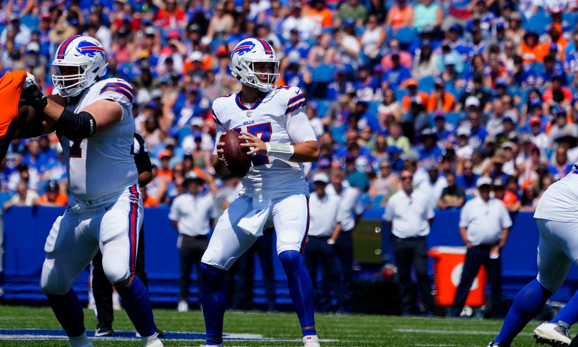Aug 20, 2022; Orchard Park, New York, USA; Buffalo Bills quarterback Josh Allen (17) looks to throw the ball against the Denver Broncos during the first half at Highmark Stadium. Mandatory Credit: Gregory Fisher-USA TODAY Sports