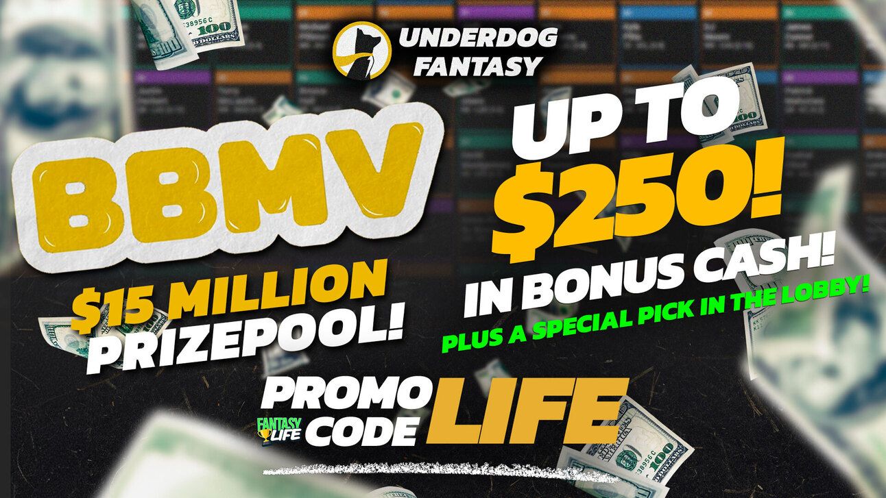 Experience the thrill of Best Ball Mania V by Underdog Fantasy, featuring an astounding $15 million prize pool! Don’t miss your chance to compete and conquer the ultimate prize pool! Sign up TODAY with our promo code: LIFE to get a Special Pick in the Pick 'em lobby AND up to $250 in Bonus Cash on your first deposit!