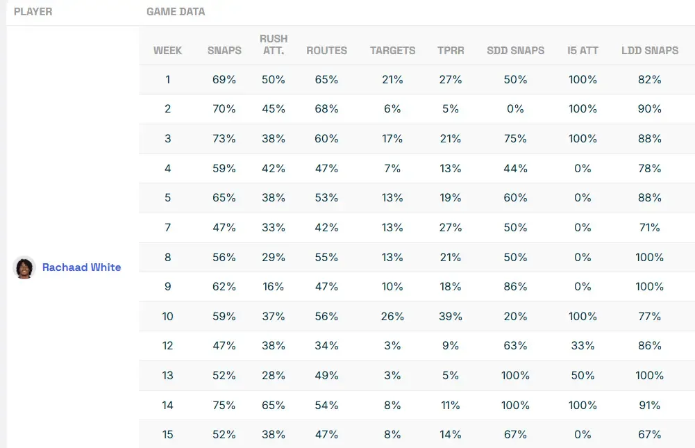 White has also been the team’s preferred back to use when it gets down inside the opposing five-yard line having taken the majority of the inside the 5 (I5) carries this season (note: no Tampa Bay RB took an I5 handoff in Week 15).