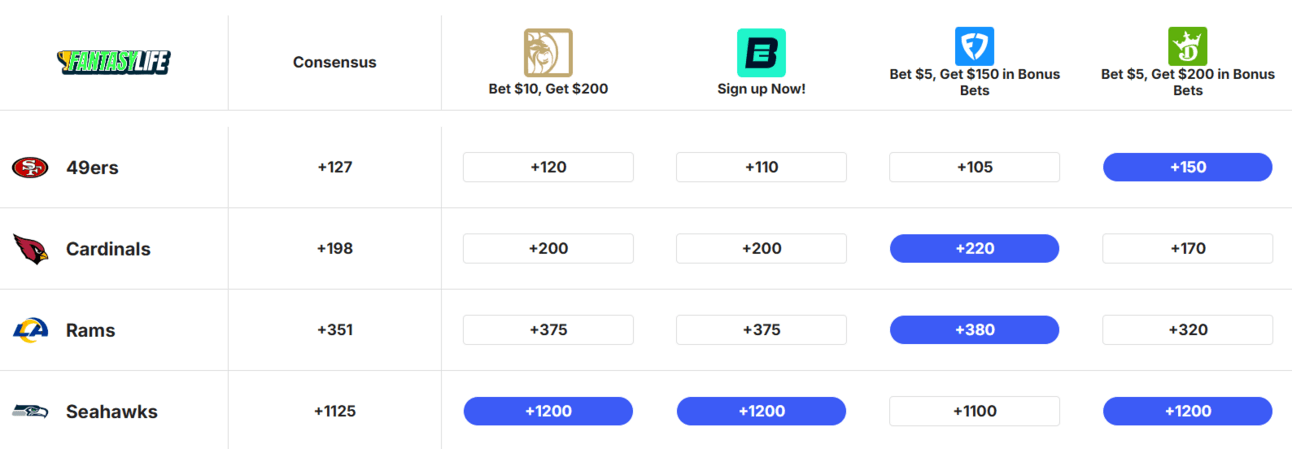 Using our NFL Futures Tool, we can see that despite the 49ers and Rams being tied, there is a big discrepancy in odds between those two teams.