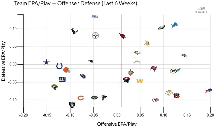 Each week I’ll be presenting the league through the lens of a single image. While no one picture or stat can truly shoulder such a load, learning to take the temperature of each team’s offensive and defensive expected points added (EPA) will sharpen your game—this per-play metric that defines the value of each play by the effect it has on the offense's likelihood to score.