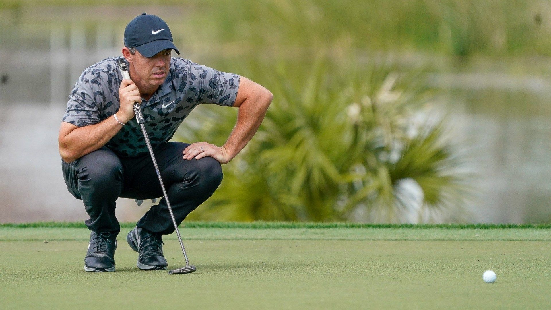 Rory McIlroy lines up his par putt on the eighth hole during the opening round of The Cognizant Classic in The Palm Beaches at PGA National Resort & Spa on Thursday, February 29, 2024, in Palm Beach Gardens, FL.