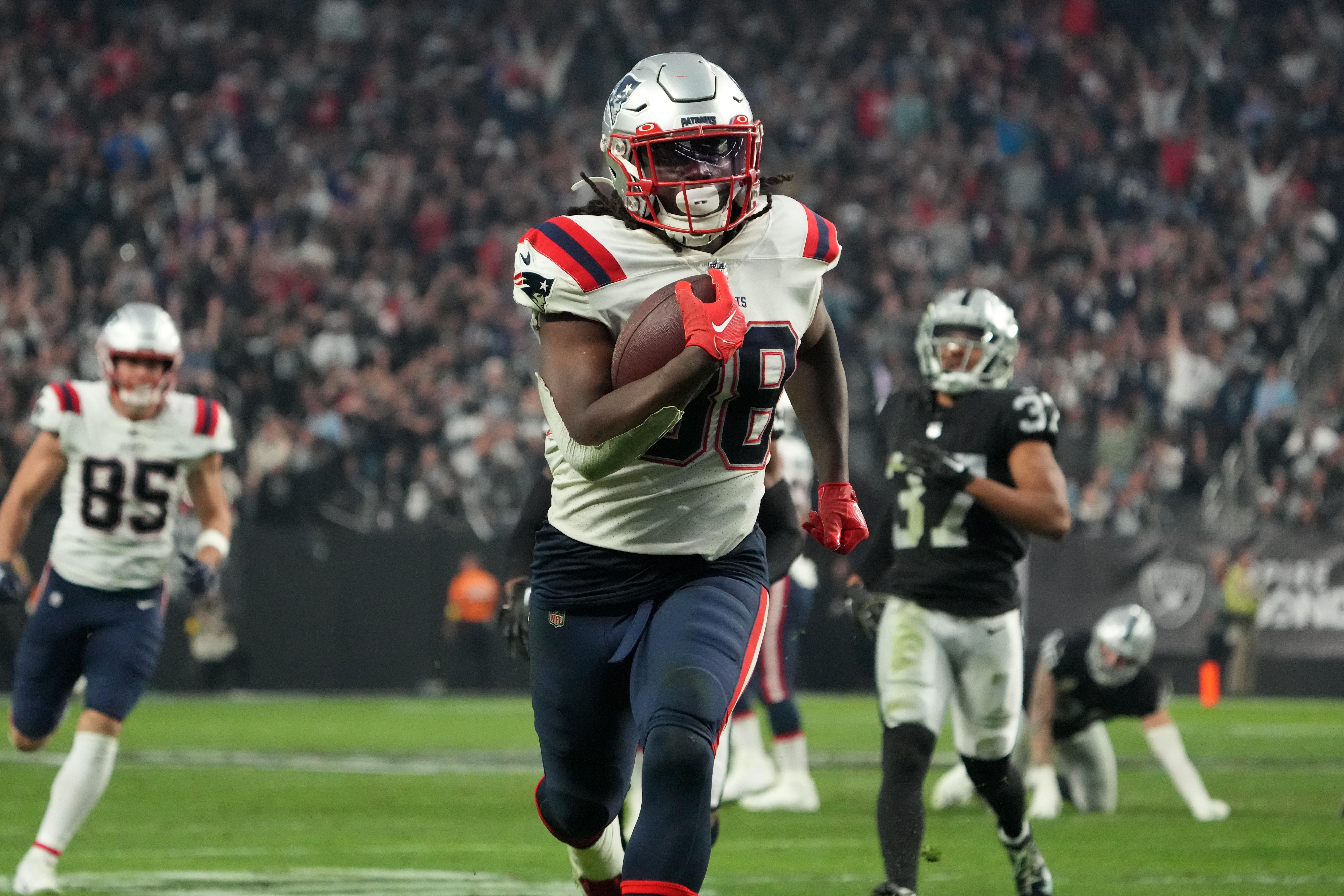 Dec 18, 2022; Paradise, Nevada, USA; New England Patriots running back Rhamondre Stevenson (38) scores on a 34-yard touchdown run in the second half against the Las Vegas Raiders at Allegiant Stadium. The Raiders defeated the Patriots 30-24. Mandatory Credit: Kirby Lee-USA TODAY Sports