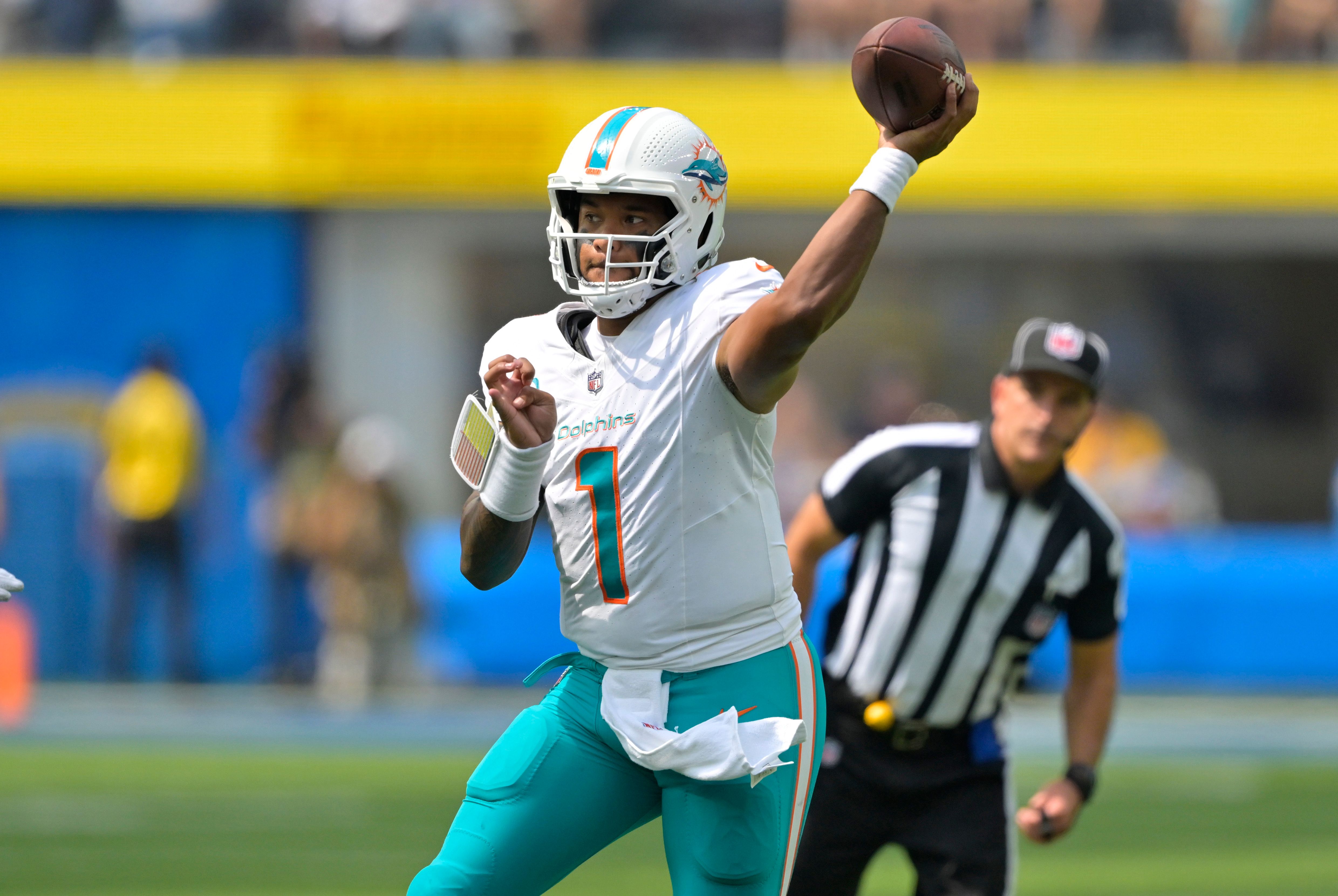 Sep 10, 2023; Inglewood, California, USA; Miami Dolphins quarterback Tua Tagovailoa (1) sets to pass in the first half against the Los Angeles Chargers at SoFi Stadium. Mandatory Credit: Jayne Kamin-Oncea-USA TODAY Sports