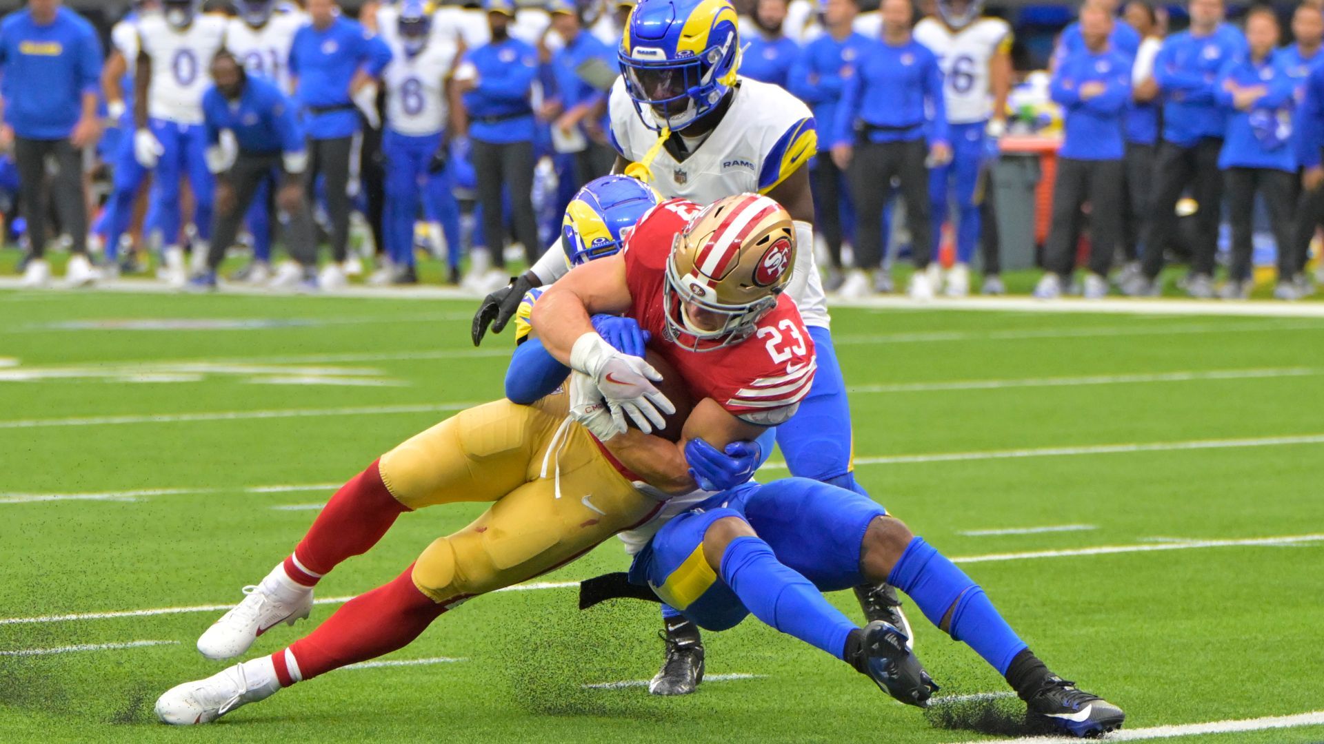 Sep 17, 2023; Inglewood, California, USA; San Francisco 49ers running back Christian McCaffrey (23) gets by Los Angeles Rams safety John Johnson III (43) for a touchdown in the first quarter at SoFi Stadium. Mandatory Credit: Jayne Kamin-Oncea-USA TODAY Sports