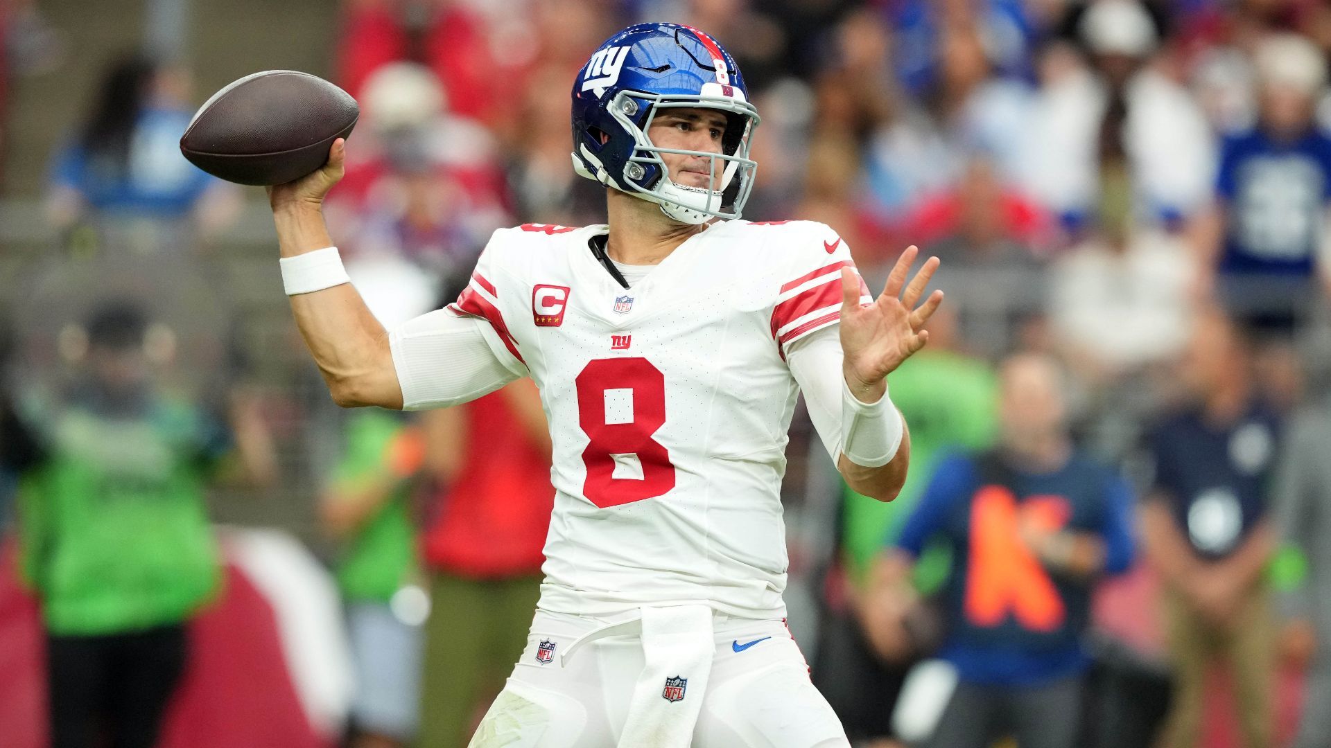 Sep 17, 2023; Glendale, Arizona, USA; New York Giants quarterback Daniel Jones (8) passes against the Arizona Cardinals during the first half at State Farm Stadium. Mandatory Credit: Joe Camporeale-USA TODAY Sports