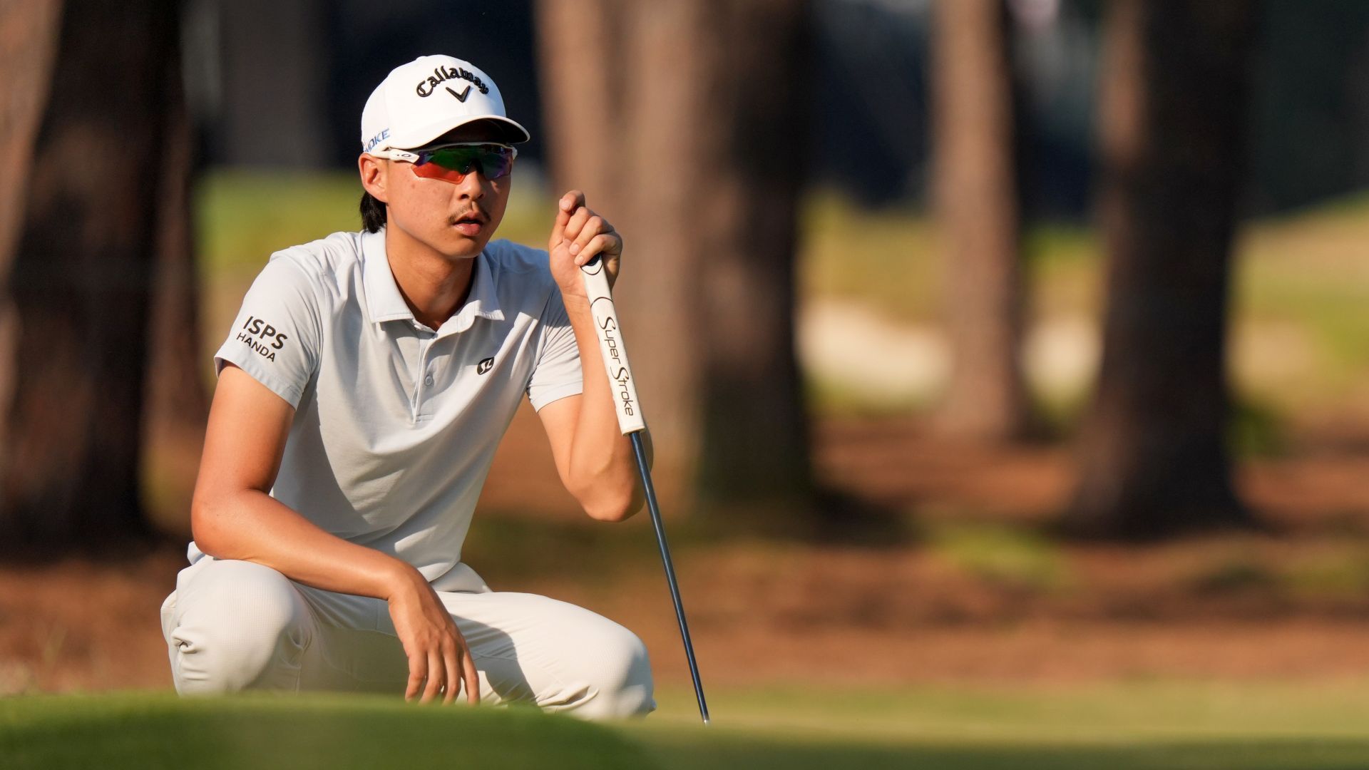 Jun 14, 2024; Pinehurst, North Carolina, USA; Min Woo Lee lines up a putt on the 6th hole during the second round of the U.S. Open golf tournament at Pinehurst No. 2. Mandatory Credit: Katie Goodale-USA TODAY Sports