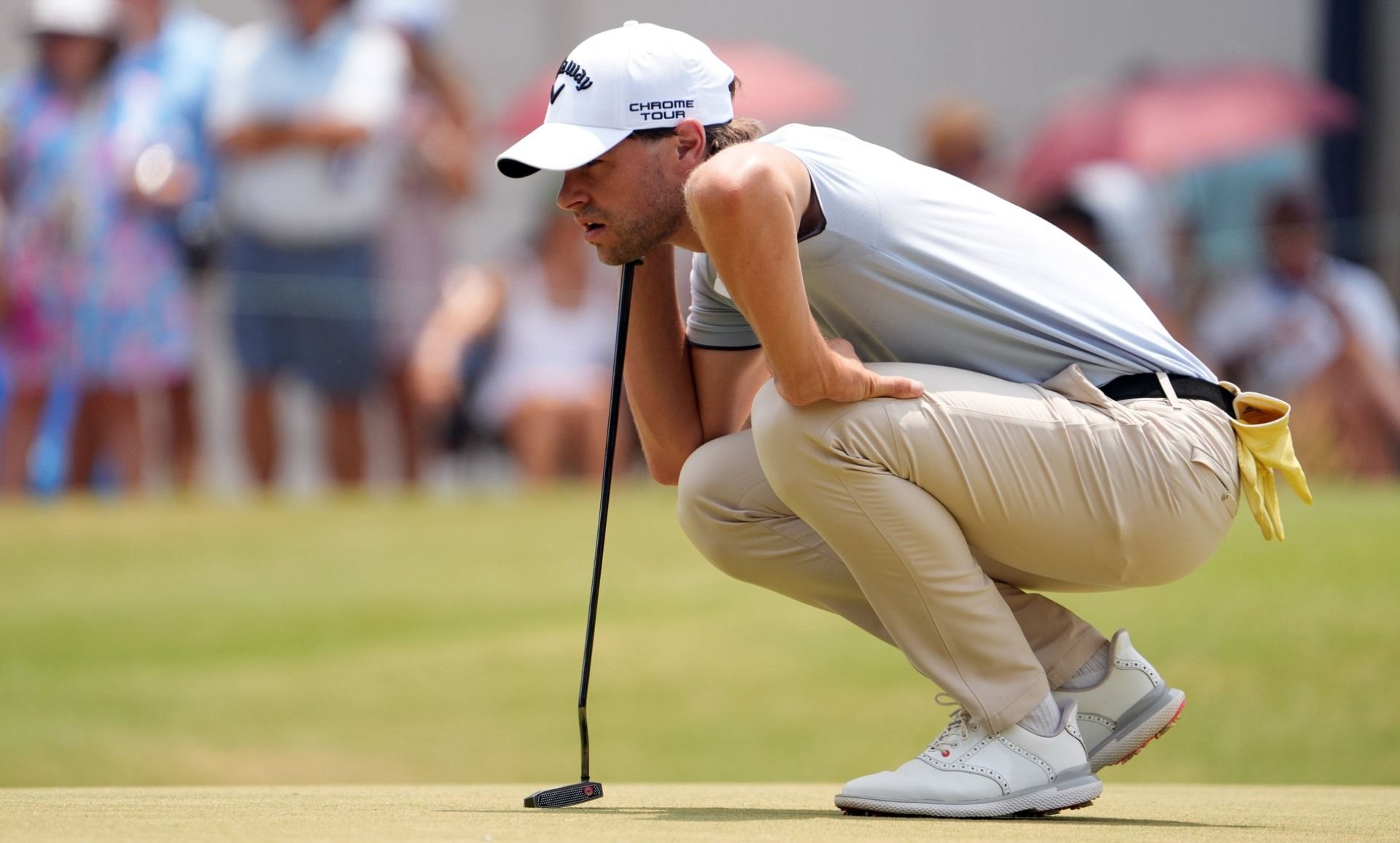 Jun 16, 2024; Pinehurst, North Carolina, USA; Thomas Detry prepares to putt on the first green during the final round of the U.S. Open golf tournament. Mandatory Credit: John David Mercer-USA TODAY Sports