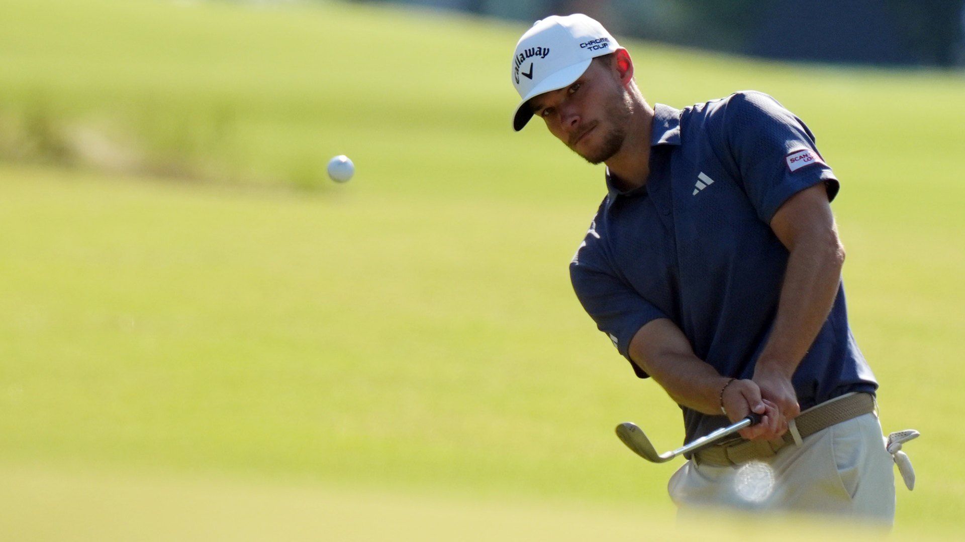 Jun 12, 2024; Pinehurst, North Carolina, USA; Nicolai Hojgaard chips up onto the sixth green during a practice round for the U.S. Open golf tournament at Pinehurst No. 2. Mandatory Credit: Katie Goodale-USA TODAY Sports
