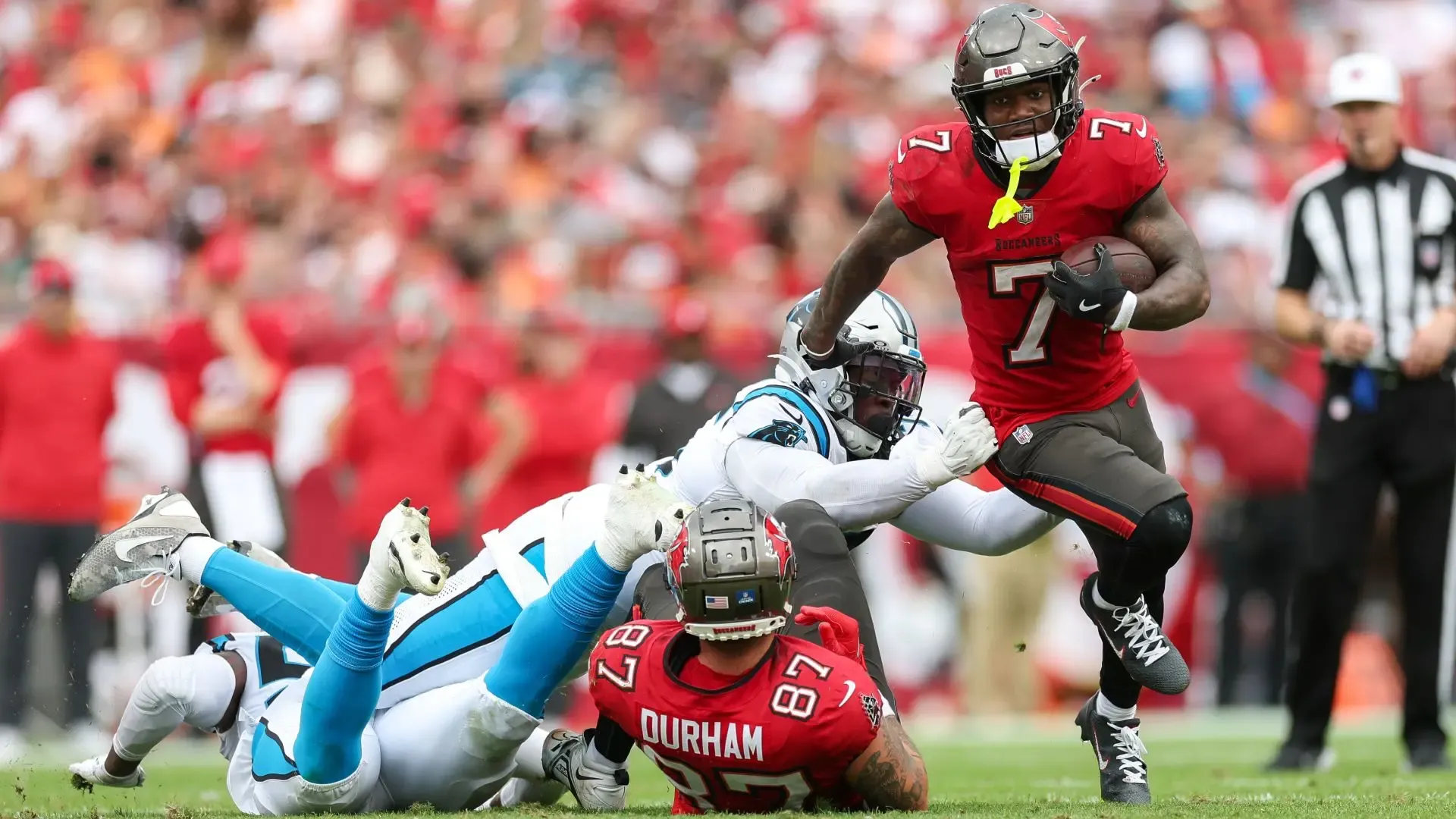 Dec 29, 2024; Tampa, Florida, USA; Tampa Bay Buccaneers running back Bucky Irving (7) runs with the ball against the Carolina Panthers in the second quarter at Raymond James Stadium. Mandatory Credit: Nathan Ray Seebeck-Imagn Images