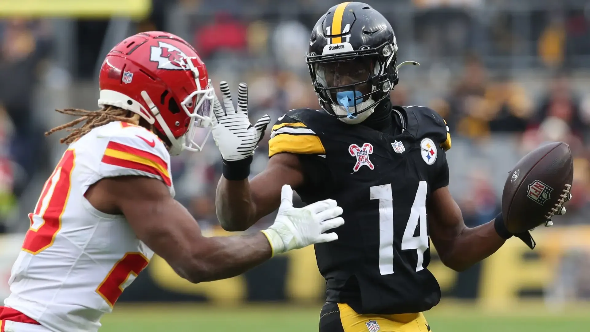 Dec 25, 2024; Pittsburgh, Pennsylvania, USA; Pittsburgh Steelers wide receiver George Pickens (14) runs after a catch as Kansas City Chiefs safety Justin Reid (20) defends during the fourth quarter at Acrisure Stadium. Mandatory Credit: Charles LeClaire-Imagn Images
