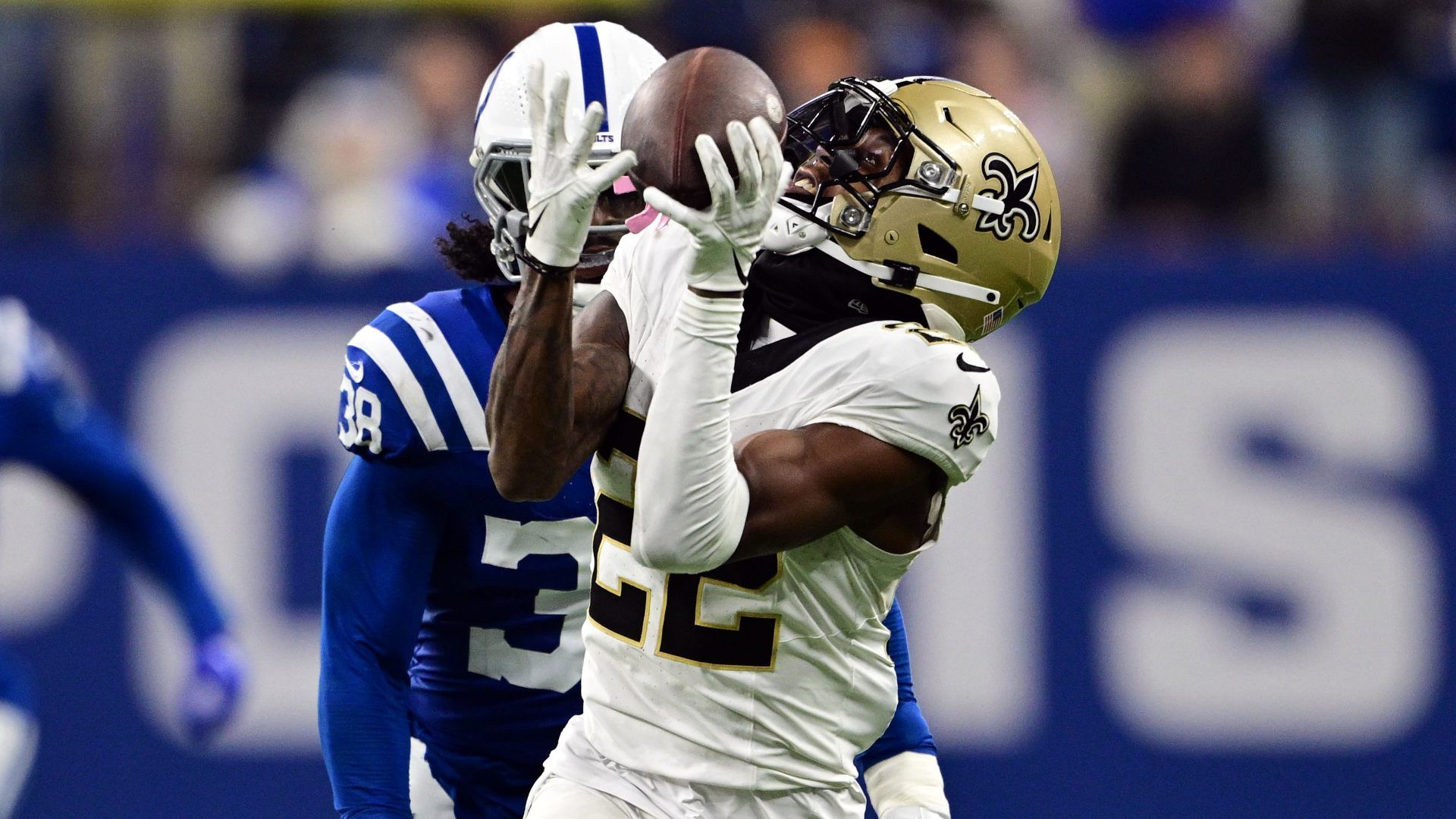 Oct 29, 2023; Indianapolis, Indiana, USA; New Orleans Saints wide receiver Rashid Shaheed (22) catches a long pass in front of Indianapolis Colts cornerback Tony Brown (38) during the second half at Lucas Oil Stadium. Mandatory Credit: Marc Lebryk-USA TODAY Sports