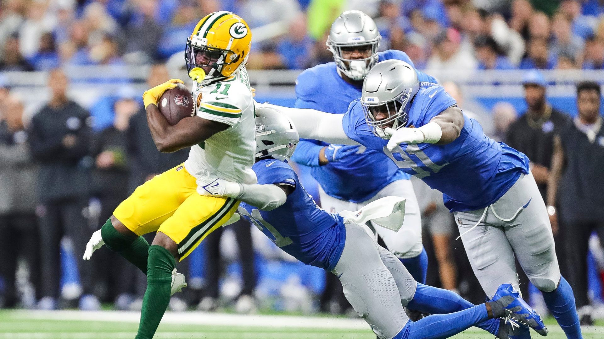 Green Bay Packers receiver Jayden Reed runs against Detroit Lions safety Tracy Walker III (21) and defensive lineman Levi Onwuzurike (91) during the first half at Ford Field in Detroit on Thursday, Nov. 23, 2023. Credit: Junfu Han / USA TODAY NETWORK