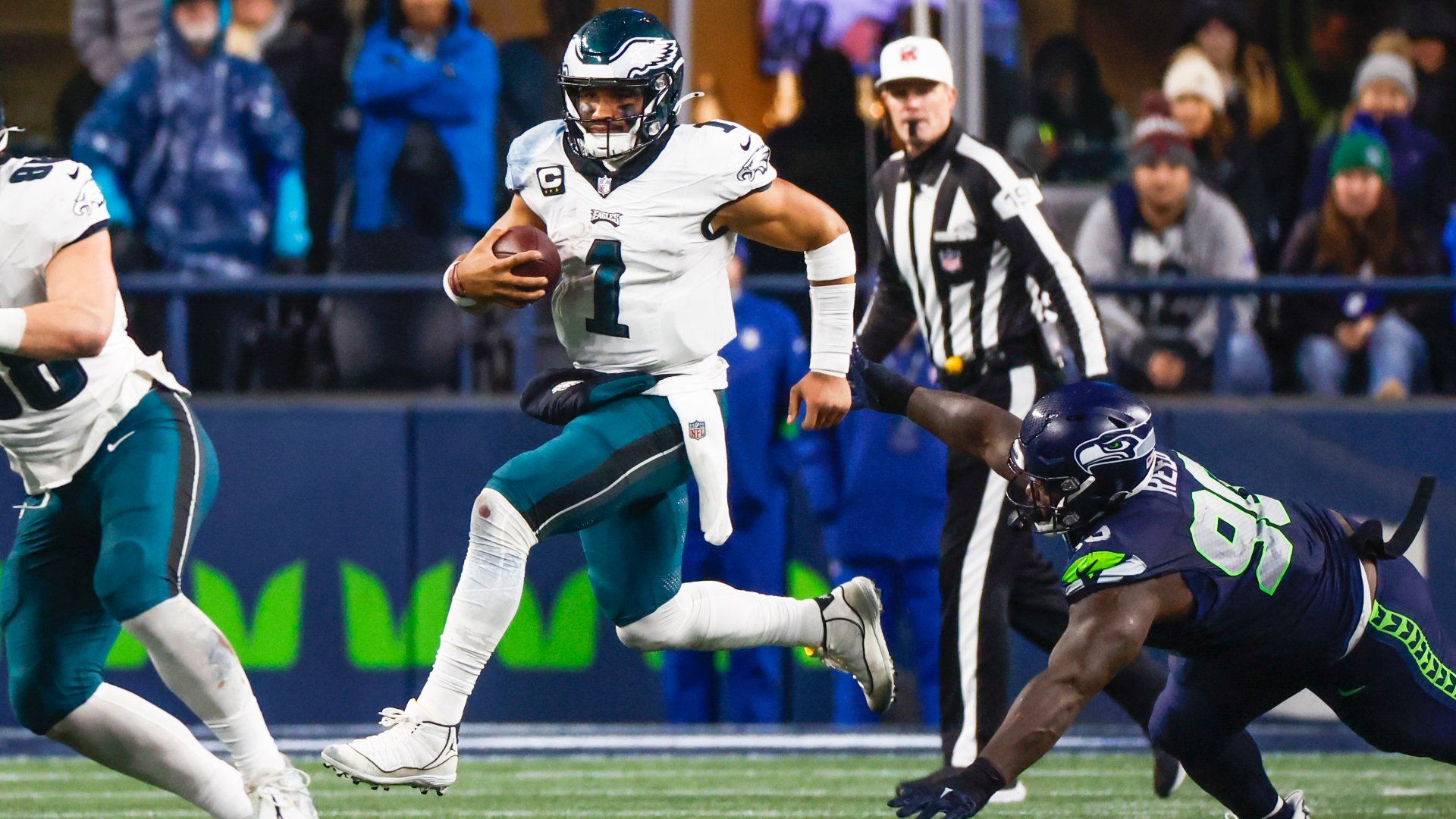Dec 18, 2023; Seattle, Washington, USA; Philadelphia Eagles quarterback Jalen Hurts (1) rushes against Seattle Seahawks defensive tackle Jarran Reed (90) during the fourth quarter at Lumen Field. Mandatory Credit: Joe Nicholson-USA TODAY Sports