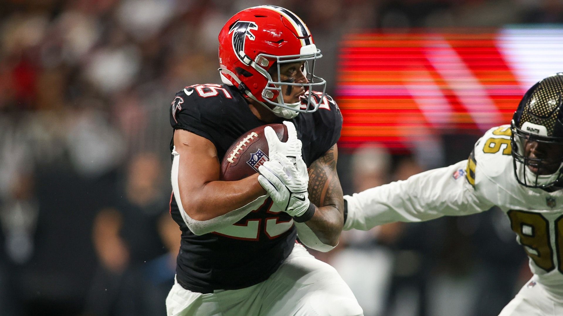 Nov 26, 2023; Atlanta, Georgia, USA; Atlanta Falcons running back Tyler Allgeier (25) runs the ball against the New Orleans Saints in the second half at Mercedes-Benz Stadium. Mandatory Credit: Brett Davis-USA TODAY Sports